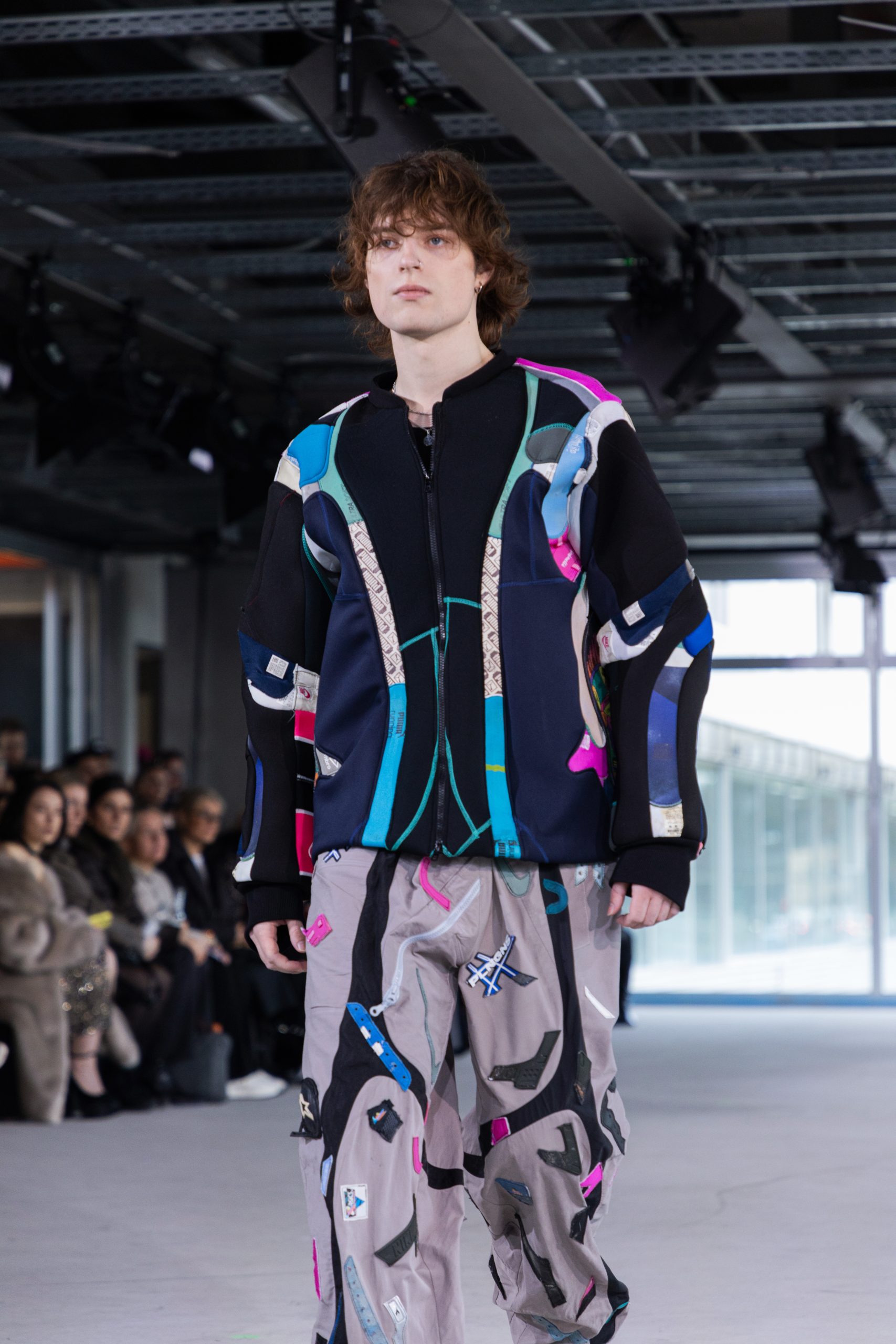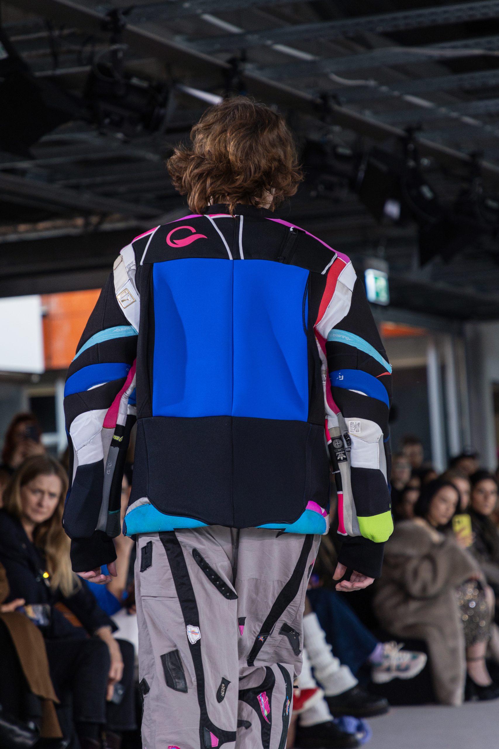 Elastic, lightweight panels extracted from repurposed diving gear for enhanced comfort and movement.